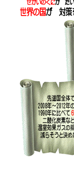 (1)気候変動枠組条約 大気中の温室効果ガス(二酸化炭素、メタン等)の増大が地球を温暖化し自然の生態系等に悪影響を及ぼすおそれがあることを背景に、大気中の温室効果ガスの濃度を安定化させることを目的として、1992年の地球環境サミット(UNCED。於リオ・デジャネイロ)で署名のため開放された条約。1994年に発効。現在我が国を含む186カ国(含む1地域)が締結(平成13年3月22日現在)。 +++++++++++++++++++++++++++++++ (2)京都議定書 上記枠組条約の目的を達成するためCOP3(第3回締約国会議)で採択された議定書。先進国等に対し、温室効果ガスを1990年比で、2008年から5年間で一定数値(日本6%、米7%、EU8%)を削減することを義務づけている。また、右削減を達成するための実施メカニズム等を導入。我が国を含む大部分の先進国は、この実施メカニズム等の詳細が決定されていないことから未批准。これら詳細はCOP6で決定されることになっている。 +++++++++++++++++++++++++++++++ 京都議定書の発効要件 55カ国以上の批准、及び締結した附属書I国(先進国等)の1990年における二酸化炭素の排出量の合計が全附属書I国の1990年の二酸化炭素の総排出量の55%以上を占めること。 +++++++++++++++++++++++++++++++