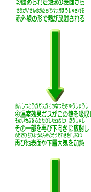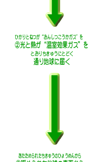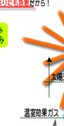 通常ならば、温室効果ガスは 地球の温度を調節してくれる大切なものですが、近年、産業の発展や森林の開拓などの人間活動の活発化に伴って、温室効果ガスの濃度が増加し、地球規模での気温上昇(温暖化)が進行していますとりわけ大気中の二酸化炭素は0.03%とわずかですが、地球の平均気温を摂氏15度程度に保つ大きな役割を演じています。
