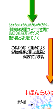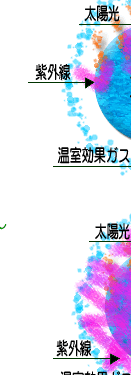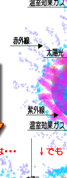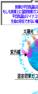地球の表面には窒素や酸素などの大気が取り巻いています。地球に届いた太陽光は地表での反射や輻射熱として最終的に宇宙に放出されますが、温室効果ガスが存在するので、急激な気温の変化が緩和されています。