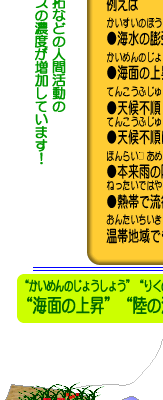 標高の低い南国の小島や、広いデルタ地帯をもつ国では、国土の消失や台風・高潮の被害の増大などの、深刻な影響をもたらすことになります。日本では、温暖化により海面が1m上昇すると、海面(満潮水位)以下の地域が2.7倍(2,300km2)に拡がり、人口410万人、資産109兆円が危険にさらされます。